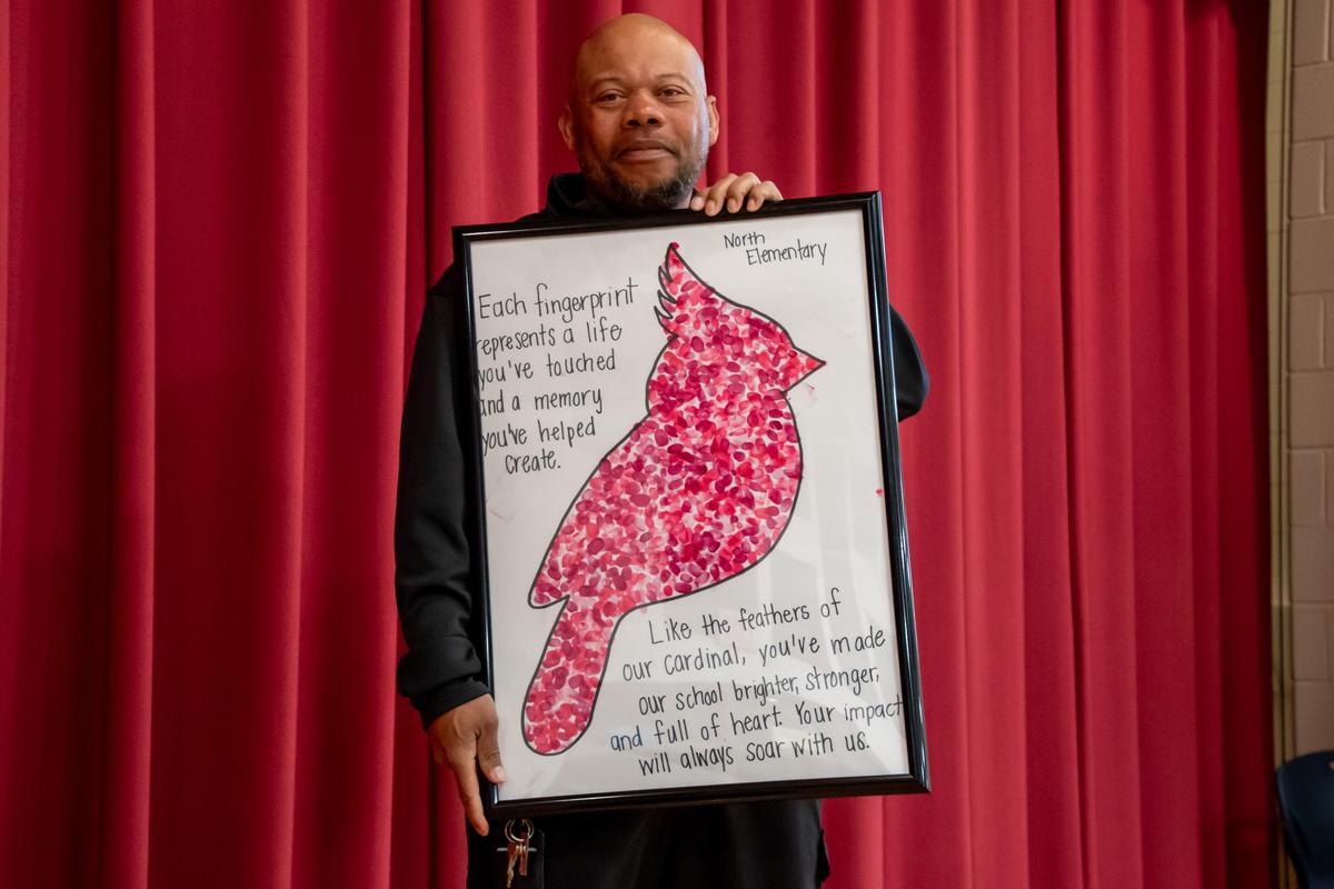 Before leaving, Mr. Flowers also received a custom gift from the North community - An artistic cardinal designed by North Elementary's Ms. Andrea Rankin, comprising over 700 fingerprints, one for each student at the school - inscribed with a message that read, "Each fingerprint represents a life you've touched and a memory you've helped create. Like the feathers of our cardinal, you've made our school brighter, stronger, and full of heart. Your impact will always soar with us."